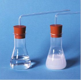 – Kalkwater is een heldere vloeistof. Je gebruikt het om te testen of er koolstofdioxide (CO₂) aanwezig is.