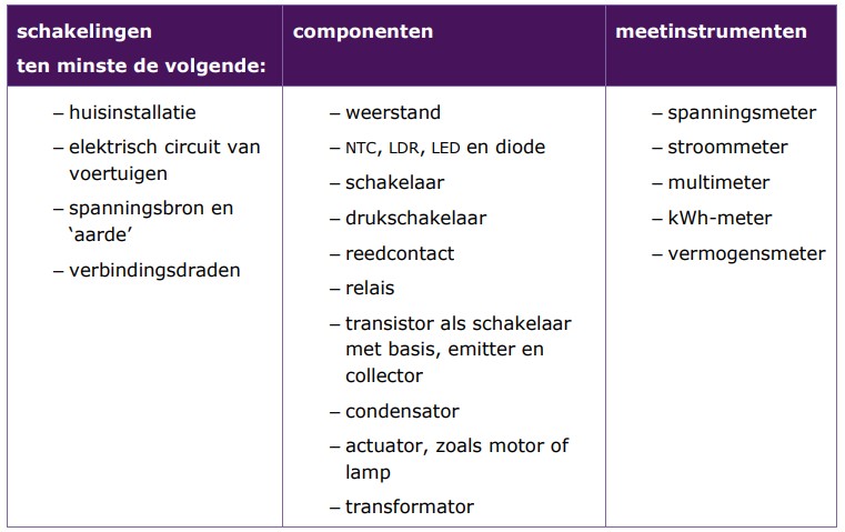 2 het principe van een gesloten stroomkring toepassen in serie en parallelschakelingen 3 uitleggen hoe een stroomkring beveiligd kan worden en op welke principes de beveiliging berust: – hoofdzekering – groepzekering – aardlekschakelaar – randaarde – 'dubbele' isolatie 4 het onderscheid uitleggen tussen geleiders en isolatoren in praktische toepassingen 5 schema’s van schakelingen gebruiken, interpreteren en aanpassen, en de werking van de componenten verklaren van tenminste: – inbrekersalarm – automatische deurbediening – elektronische temperatuursensor – schemerschakeling – dimmer – discolichten 6 in serieschakelingen en in parallelschakelingen een relatie leggen tussen spanning en stroom en hiermee berekeningen uitvoeren 7 de gebruikstijd van een batterij/accu bepalen aan de hand van de capaciteit 8 het vermogen van apparaten, het totale vermogen en het energieverbruik berekenen in serieschakelingen en parallelschakelingen 9 het totale energiegebruik van elektrische apparaten meten met een kWhmeter en energiekosten berekenen: – kWh – joule 10 een beargumenteerde keuze maken uit gelijksoortige elektrische apparaten ten aanzien van energiegebruik, rendement, capaciteit, levensduur en veiligheid, ten minste: – spaarlampen – leds – accu’s – huishoudelijke apparaten – moderne apparaten (bv LCD-schermen, smartphone) 11 basisbegrippen van magnetisme kennen en toepassen bij de dynamo, transformator, luidspreker, relais en reedcontact: – permanente magneet – noord en zuidpool – aantrekking en afstoting tussen polen – veldlijnen – spoel – weekijzeren kern – elektromagneet 12 de onderdelen van een dynamo benoemen en beschrijven hoe hiermee elektrische energie kan worden opgewekt 13 de onderdelen van een transformator benoemen, hiermee de werking van de transformator uitleggen en toepassingen geven: – primaire en secundaire kring – transformatie van spanning – overdracht van vermogen / ideale transformator – toepassingen ten minste: – adapter – halogeenverlichting – elektriciteitstransport